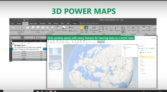 This is another new tool in Excel 2016 that lets you look at information in ways you might not have seen in the two-dimensional format. This helps you strategically create your data on a 3D map. You need latitude and longitude data to do this. You can also import your own maps into 3D Power Maps.