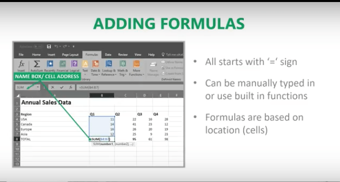 Let’s say you want to add a bunch of numbers together in your Worksheet. You can type = sum (a1:a5) in the cell where you want the answer to appear. Or you can do this and drag your mouse across the cells you want to add. Type =sum ( and drag your mouse across the cells and hit ENTER. The sum will appear in the cell without you having to typing in all the numbers! When you put your cursor on the cell, you will see the actual formula you just created.