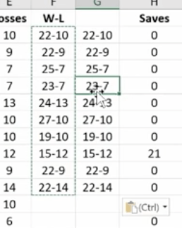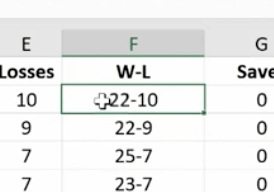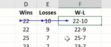 If you do want to delete the Wins and Losses columns, you must first make a new column. Copy the W-L numbers and Paste Value in the new column. This way you’ve moved from a formula to the new information. If you delete your source information without taking this step you’ll be left with nothing.