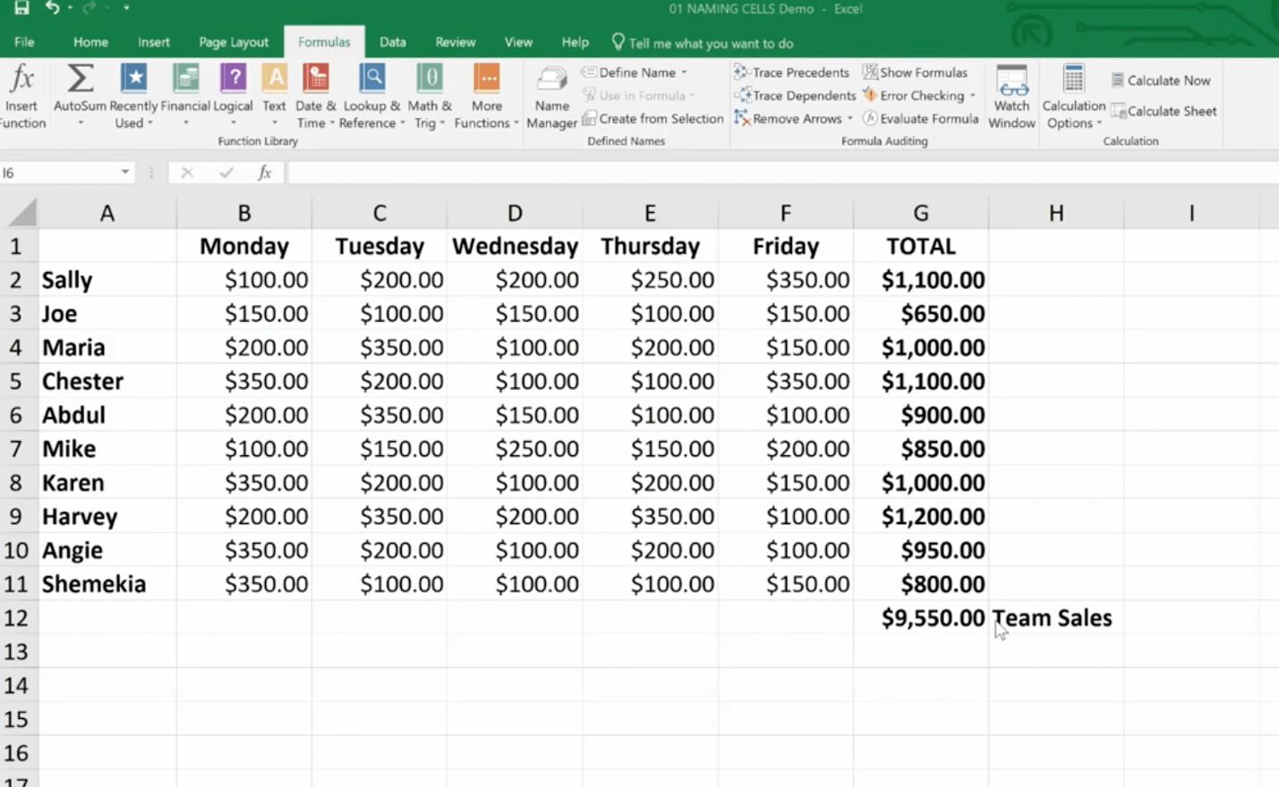 How do you name a cell? You do so by the cell’s coordinates, such as A2 or B3, etc. When you write formulas using Excel’s coordinates and ranges you are “speaking” Excel’s language. However, this can be cumbersome. For example, here G12 is significant because it refers to our Team Sales.
