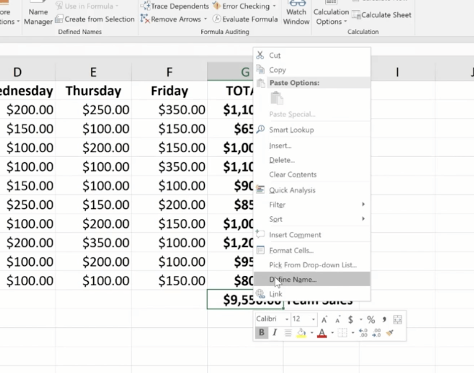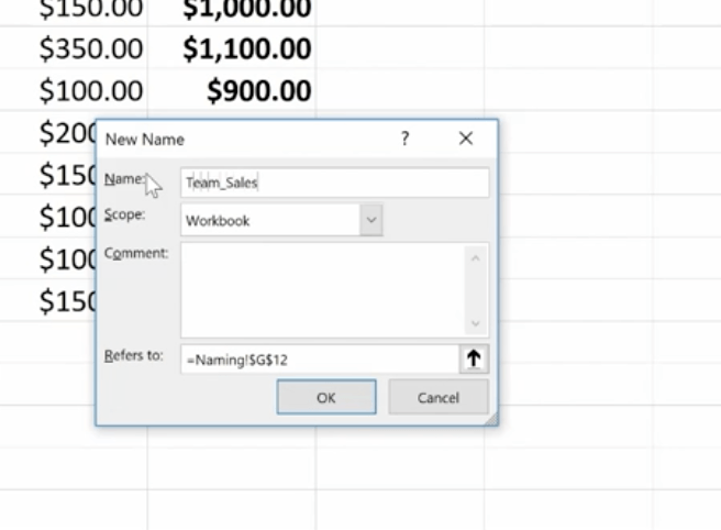 To name our G12 cell Team Sales, right-click on the cell, choose Define Name, and type “Team Sales” into the dialog box. You can also add any comments you want here. Then click Ok.