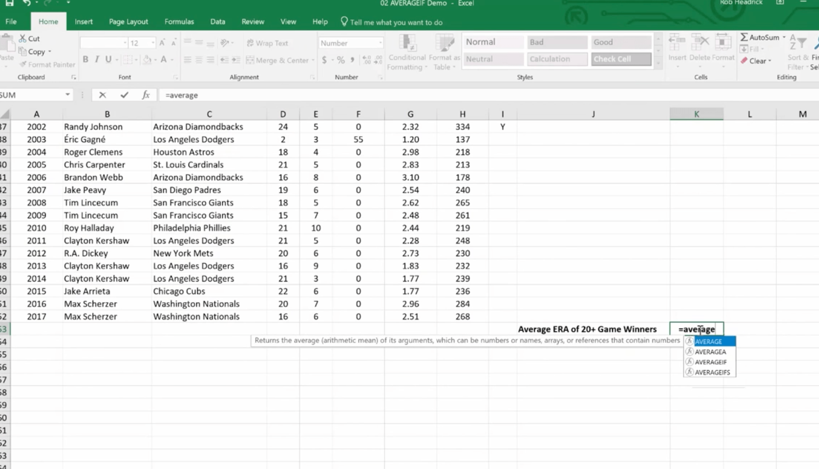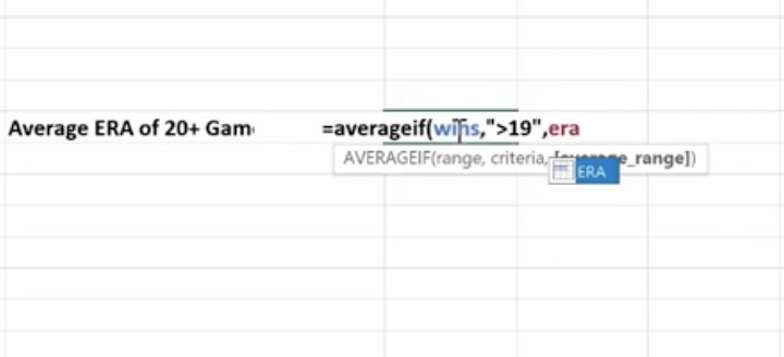 The Average If can be used to figure out the average of a range based on certain criteria. Here we’re going calculate the Average If of the ERA of 20+ Game Winners from the spreadsheet we developed in our last session.