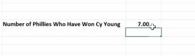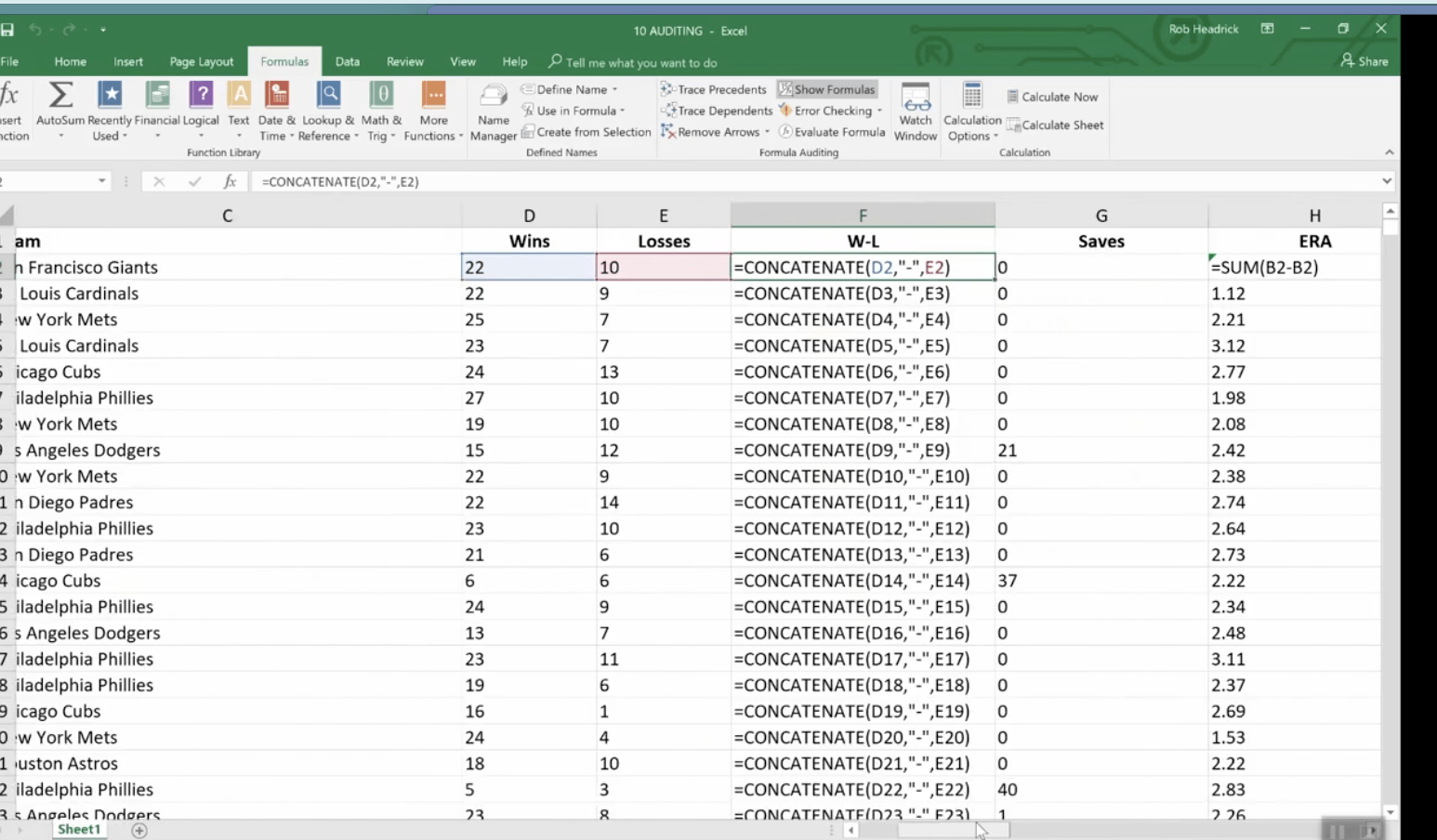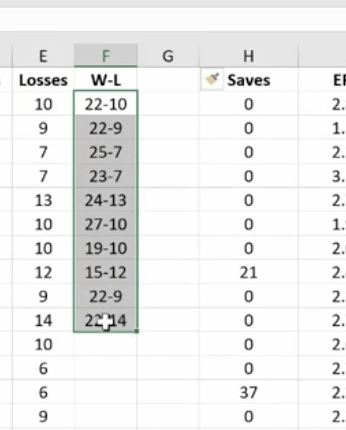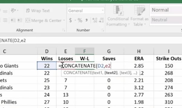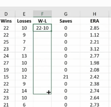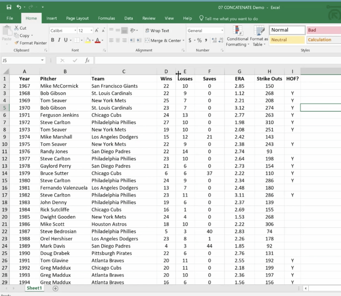 The first text function we’ll show you is concatenate. It links things together in a chain or series. Here, we have our Cy Young list. But we no longer need to see our Wins and Losses in a separate column.