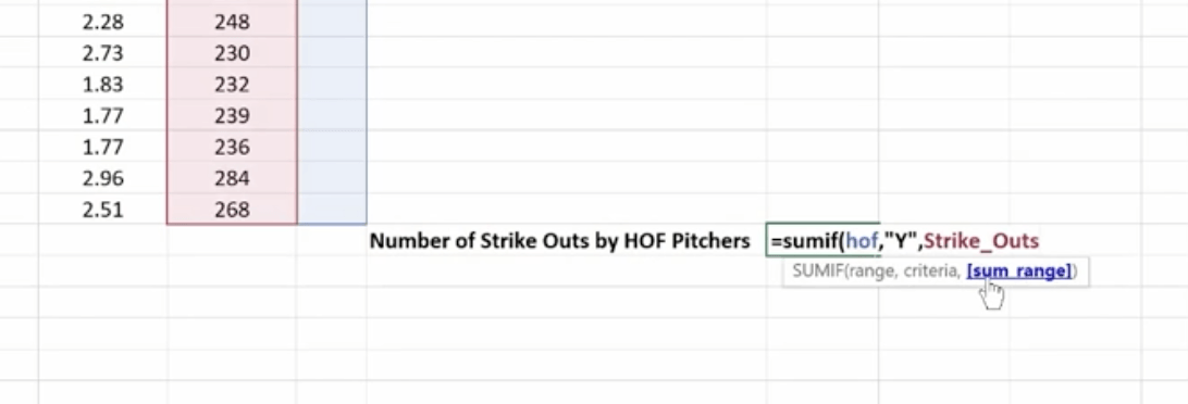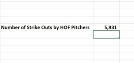 Now we’re going to use the Sum If function to calculate the number of strikeouts by the pitchers on this list who are in the Baseball Hall of Fame.