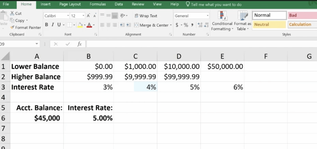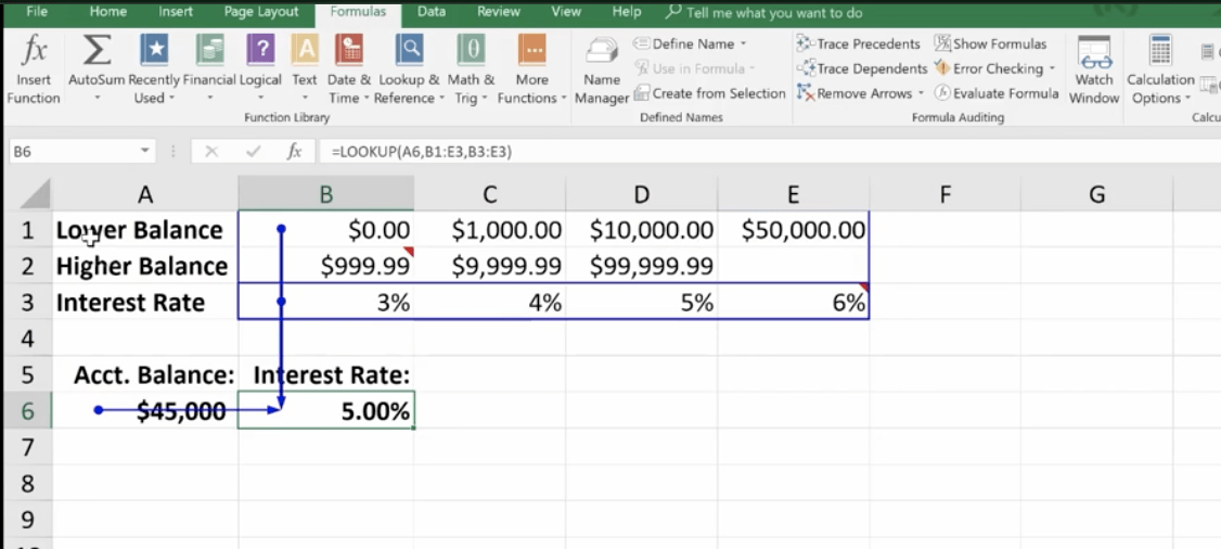 Cell A6 shows the balance of a specific account. The Lookup Function is used in B6. It looks up the interest rate and applies it to the account balance of $45,000. This is what the formula looks like in the bar at the top: