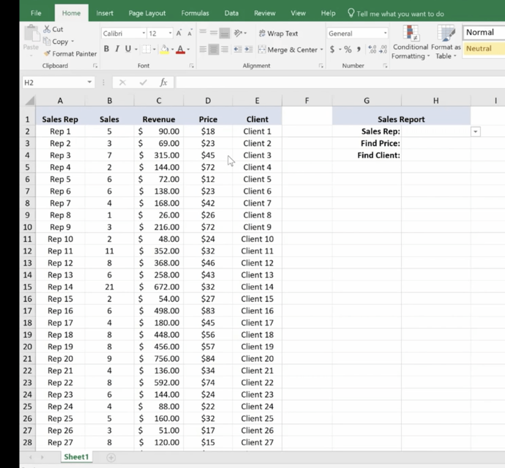 V Lookup and H Lookup are used to pull information into reports. We’re going to use Report Setup. Here, we have a worksheet that references salespeople, sales data, pricing, revenue, and the clients that they sold to. You’ll see on the top right where we set up a report with names referencing sales data.
