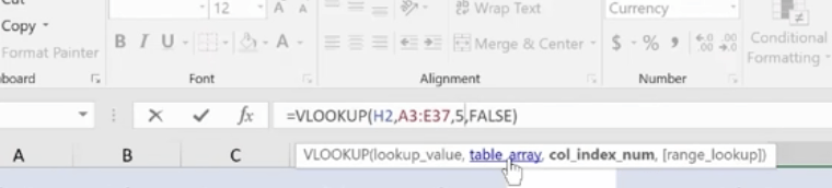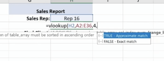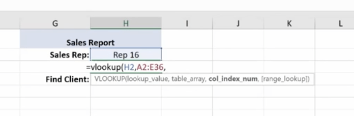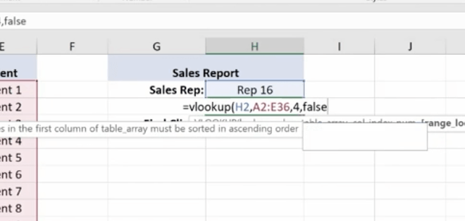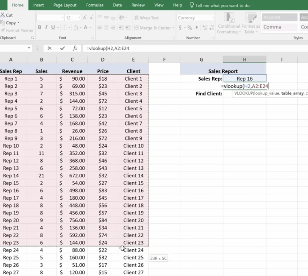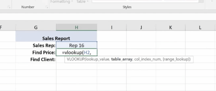 To Find Price, key in =vlookup and the corresponding cell number for Rep 16, plus the table array which is the entire table not including the header at the top.