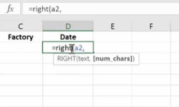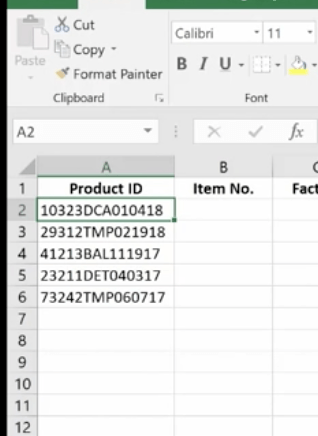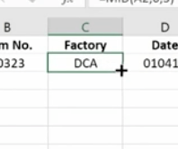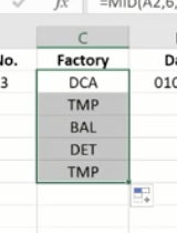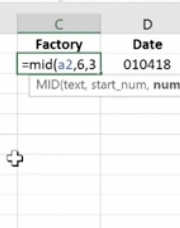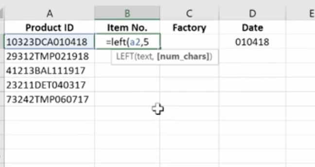These are used to tell Excel that you only want part of a text string in a particular cell. Here, we have a product list and product IDs that tell us the date of manufacturer, the item number, and the factory where it was made. We’re going to pull the data out so we can put it in columns to use in different ways.