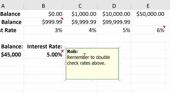 These are designed to ease the finding and referencing of data, especially in large tables. Here, cells A1 and E3 relate to a variable interest rate that is paid on a bank account. For balances under $1,000, the interest rate is 3% – between $1,000 and $10,000, the interest rate is 4%, etc.